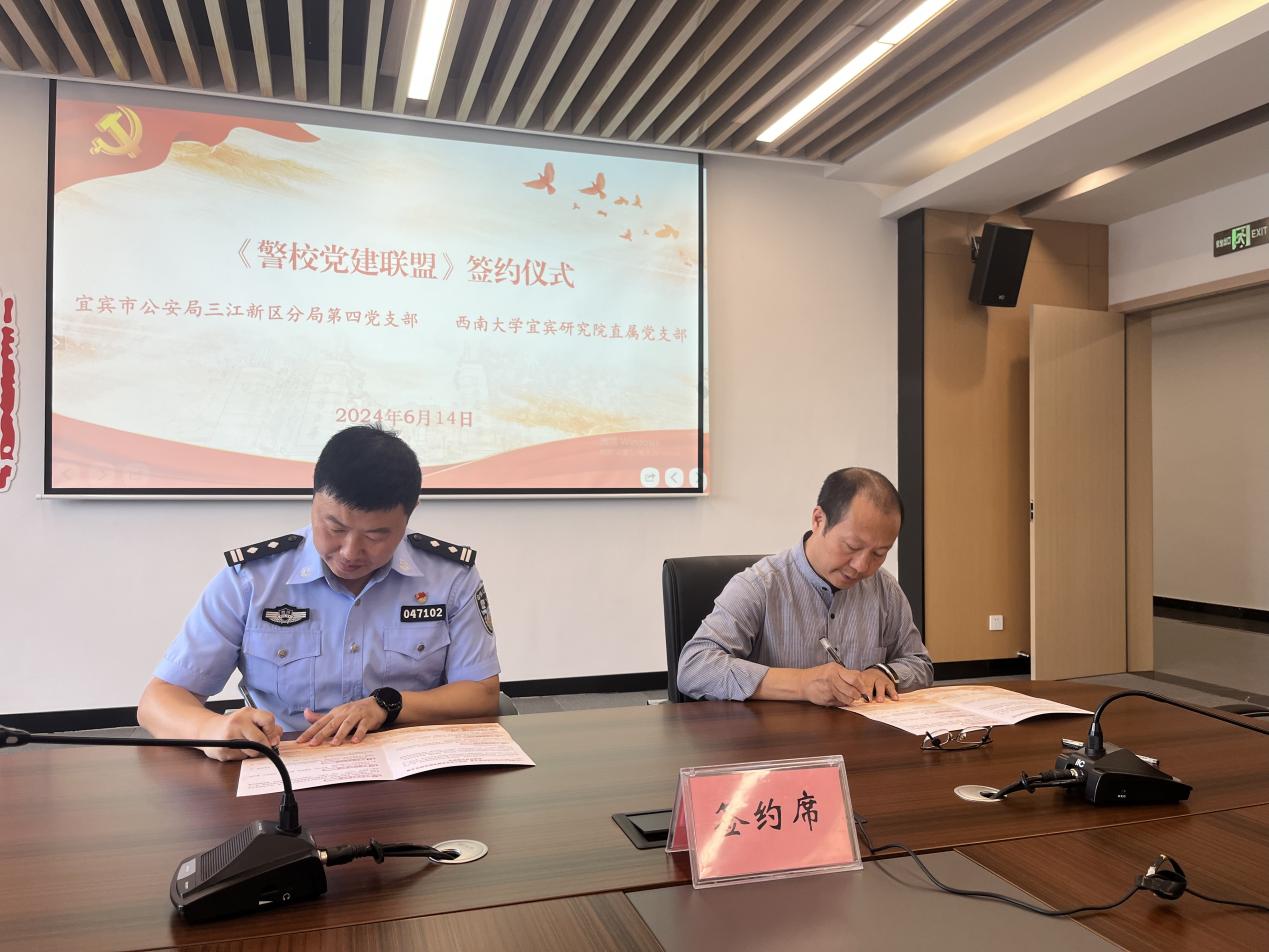活动伊始,陈金凤同志与任学峰同志代表双方党支部共同签订了警校《党建联盟协议》,标志着警院双方将在党建工作上建立更加紧密的合作关系。随后,任学峰同志引导学习了习近平总书记《论党的自我革命》篇目《严明党的组织纪律》、中共宜宾市委六届八次全会精神,陈金凤同志引导学习了中共重庆市委六届五次全会精神,并传达了学校党委《关于深入学习贯彻习近平总书记视察重庆重要讲话重要指示精神加快建设特色鲜明世界一流大学的实施方案》精神。