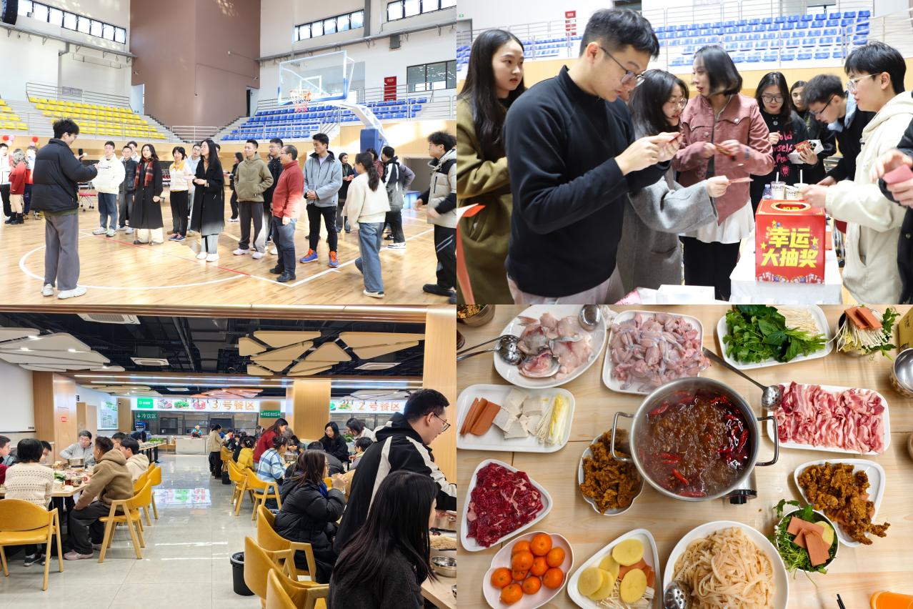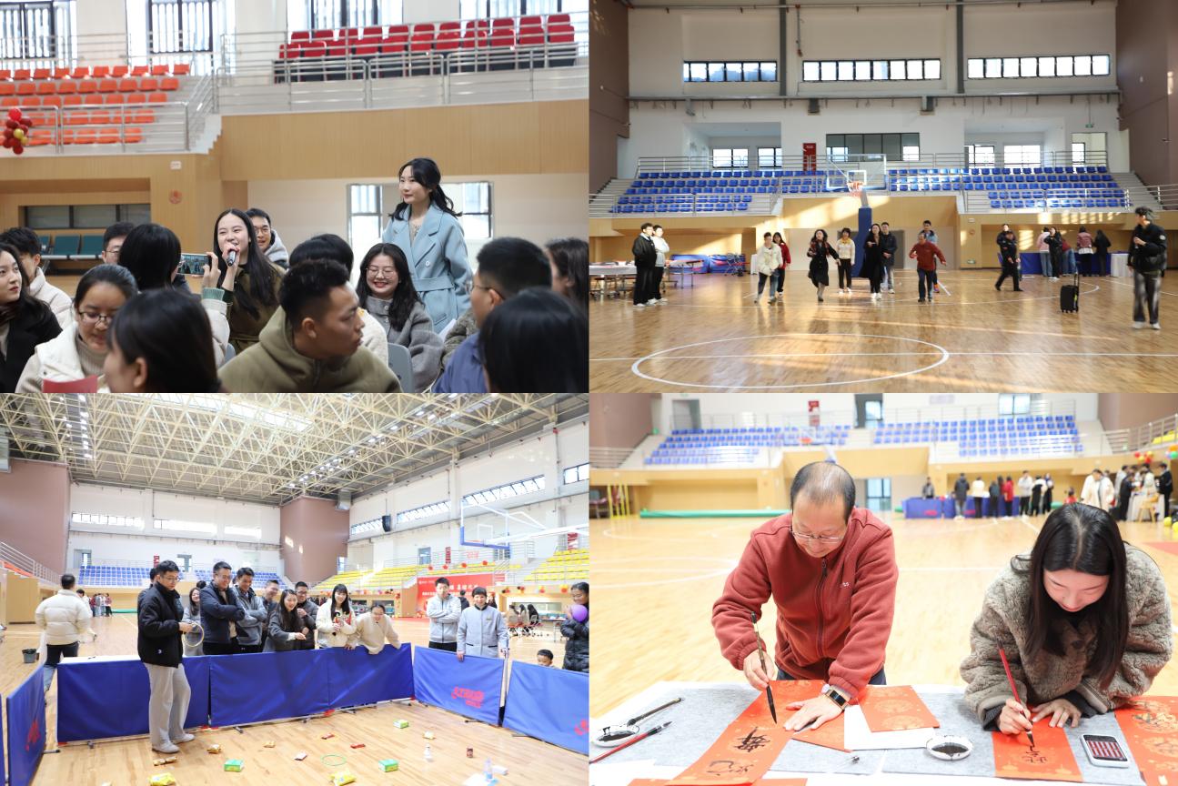 活动现场,还有写对联、剪纸、套圈、投壶纳祥、你比我猜等趣味游戏,大家踊跃参加,相互合作。陈院长带领同学们现场挥毫,书写春联和福字,献上新年祝福。通过一系列丰富的游戏活动,每位参与者都赢得了抽奖券,抽奖处频频传出喜讯,没有抽中奖的又再次投入游戏中赢取抽奖券,体育馆洋溢着一片欢声笑语。最后,大家移步食堂,享用热气腾腾的火锅,在寒冷的冬日,畅谈研究院的温暖、师生间的温情以及对新年的希望。